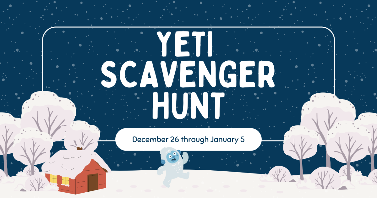Primary tabs Upcoming List Month Week Day Remind Me Add To My Calendar Print Share Program Type: Other Age Group: Children Program Description Event Details Drop in anytime from December 26 through January 5 to find the hidden yetis, solve the yeti's riddle, and win a small prize.